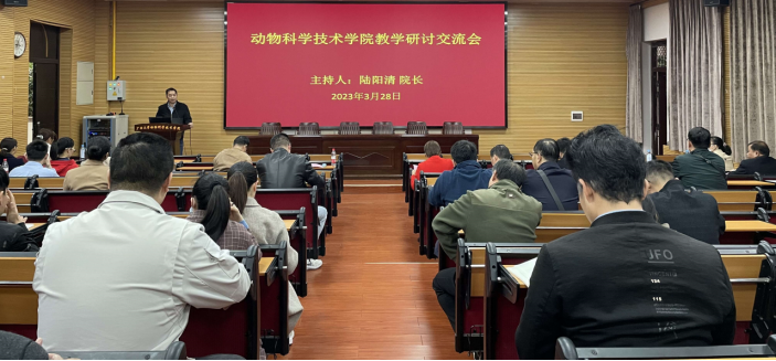 为乐鱼(中国)本科提升专任教师教学质量,更好迎接本科教学审核评估工作, 2023年3月28日下午3点,我院召开了教学研讨交流会。我们邀请了教务处副处长彭林欣、督导团郭亚芬老师到会指导,动科院党委书记顾慕娴、院长陆阳清、党委副书记沙健、副院长宁鹏飞以及动科院全体专任教师参加。会议由学院院长陆阳清主持。