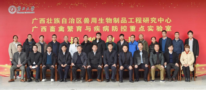 最后,陆阳清常务副院长邀请了广西农业农村厅二级巡视员黄庭军和石德顺教授共同为广西畜禽繁育与疾病防控重点实验室揭牌,邀请了广西大学副校长罗廷荣和广西农业农村厅副厅长梁纪豪为广西壮族自治区兽用生物制品工程研究中心揭牌。