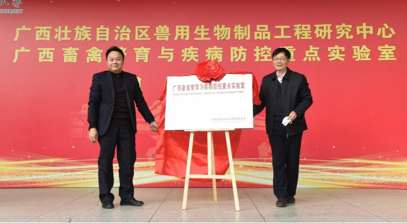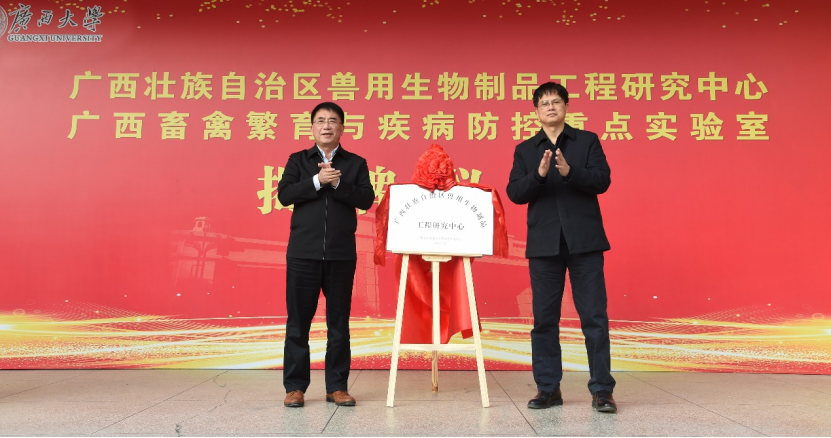 广西大学副校长罗廷荣和广西农业农村厅副厅长梁纪豪为广西壮族自治区兽用生物制品工程研究中心揭牌