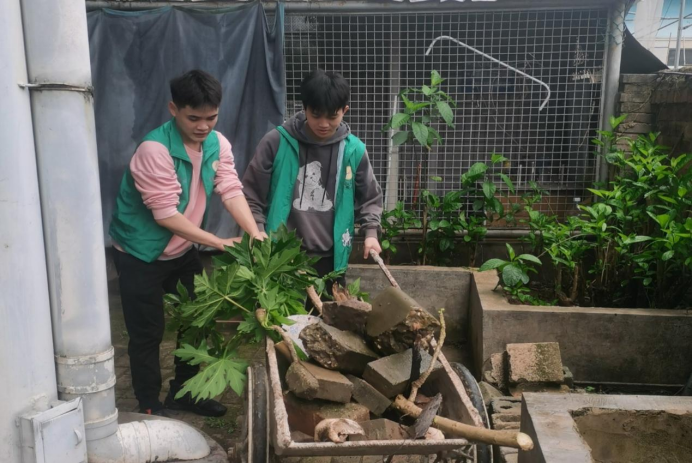 上午10点,全体同志拿上扫把、拖把、推车等劳动工具,开始了热火朝天的打扫。虽然天空下着蒙蒙细雨,但党员同志们都充满了干劲和激情,所有同志都积极投入志愿劳动,三、五人作为一个小组,有人清洁地面,有人清理杂草树枝,有人清运垃圾。大家默契配合,经过一个小时的劳动,整个球馆焕然一新。老教师们纷纷表示感谢,同志们也从劳动中收获了赠人玫瑰,手留余香的快乐。