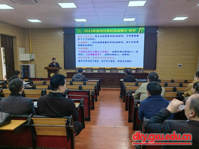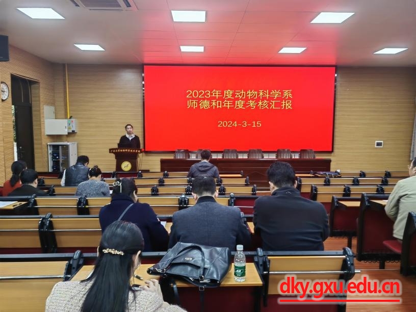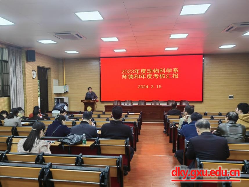 会上,蒋钦杨副院长首先介绍了学校开展师德考核和年度考核的相关文件、动物科学系师德考核和年度考核细则以及相关考核流程。接着,陆阳清院长介绍了教师进行师德考核和年度考核的重要性,并强调此次考核不仅是对个人过去一年业绩的评定,更是一次难得的相互交流相互学习的机会。之后,动物科学系的各位教师依次用PPT的形式对个人2023年度在师德师风、教学、科研、人才培养、学科建设、社会服务等方面的表现进行了简短汇报。与此同时,现场其他各位教师根据汇报者的情况,进行民主评议。汇报结束后,蒋钦杨副院长做总结发言。他一方面肯定了动物科学系各位教师过去一年所取得的成绩,同时也指出了存在的不足。他号召在新的一年,动物科学系要强优势、补短板,在教学成果申报、一流课程和优秀教材建设、国家级大创竞赛等方面加强投入,力争取得更大的突破,为学科建设添砖加瓦。