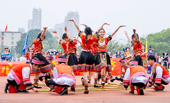 竹竿开合铿锵有力,舞蹈动作整齐划一。和着节奏轻快的《悠悠壮乡情》,由广西大学动物与科学技术学院和农学院为代表的广西大学学子们尽情起舞。广西大学 石诗悦/摄