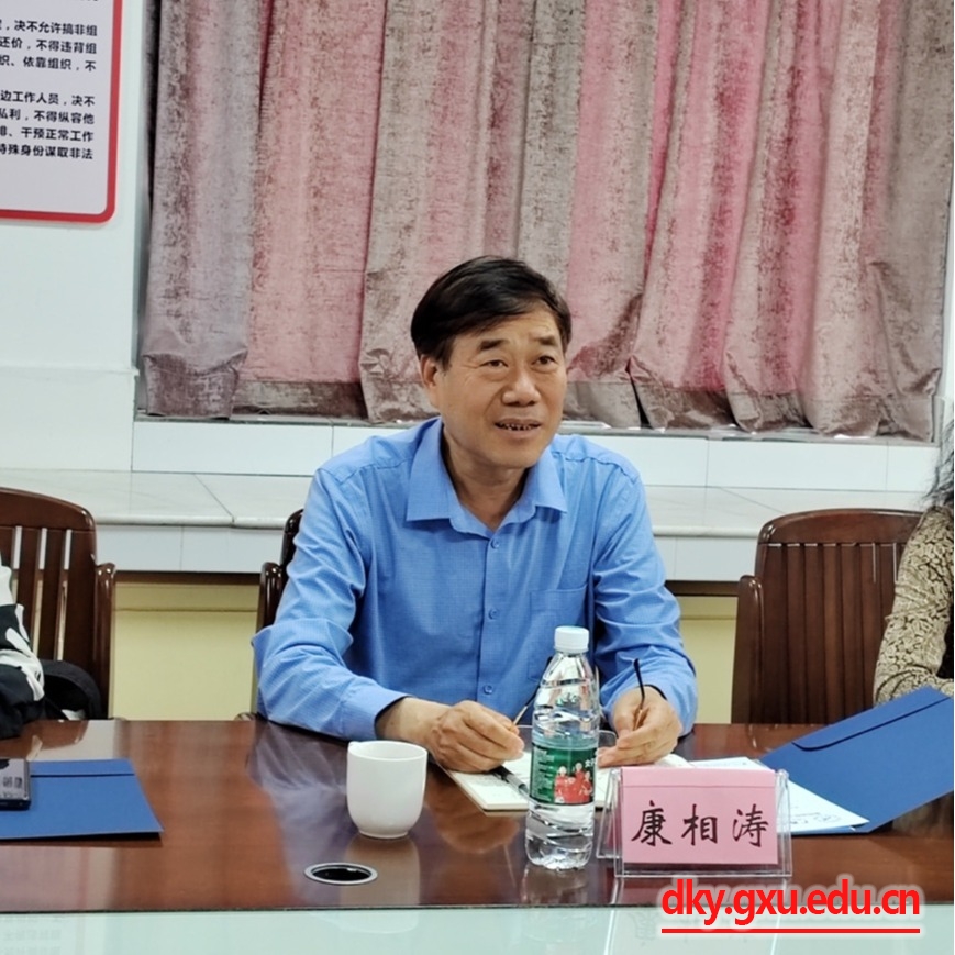 在座谈交流会上,罗廷荣教授愉快的回忆起与康院士进行科研项目合作的经历,感谢康相涛院士对广西大学畜牧学科和兽医学科建设给予的支持,希望康院士能够继续在广西地方鸡种质资源保护及利用、畜禽种业生物育种技术研发等方面为广西大学的科研团队提供指导和支持。陆阳清院长就广西大学的发展历程和我院学科建设、师资力量、科研平台、人才培养等方面的优势做法进行了介绍。院党委韦小强书记围绕学院在“大平台、大人才、大项目”引育等方面开展的工作进行了介绍,希望双方能够在科研平台、学科建设以及青年教师培养等方面进行合作。康相涛院士就学院学科发展、平台基地建设、校企合作教师人才培养等方面进行了指导,提出了诸多建设性意见和建议。最后,陆阳清院长表示,期待加强与康相涛院士团队、广西富凤农牧集团有限公司的合作交流,共同建设好合作平台,实现高校科研成果的转化落地,助力高校和企业共同发展。