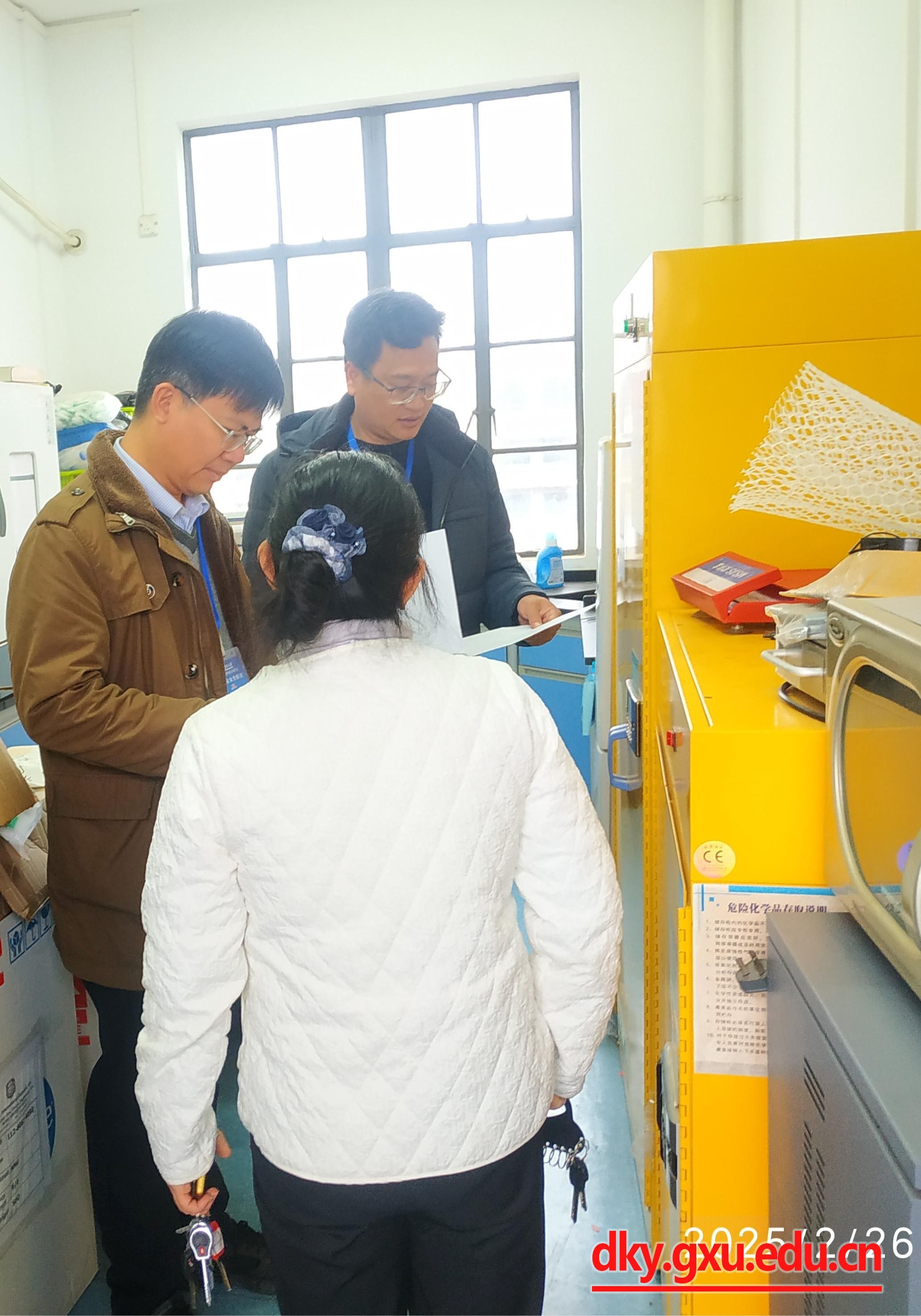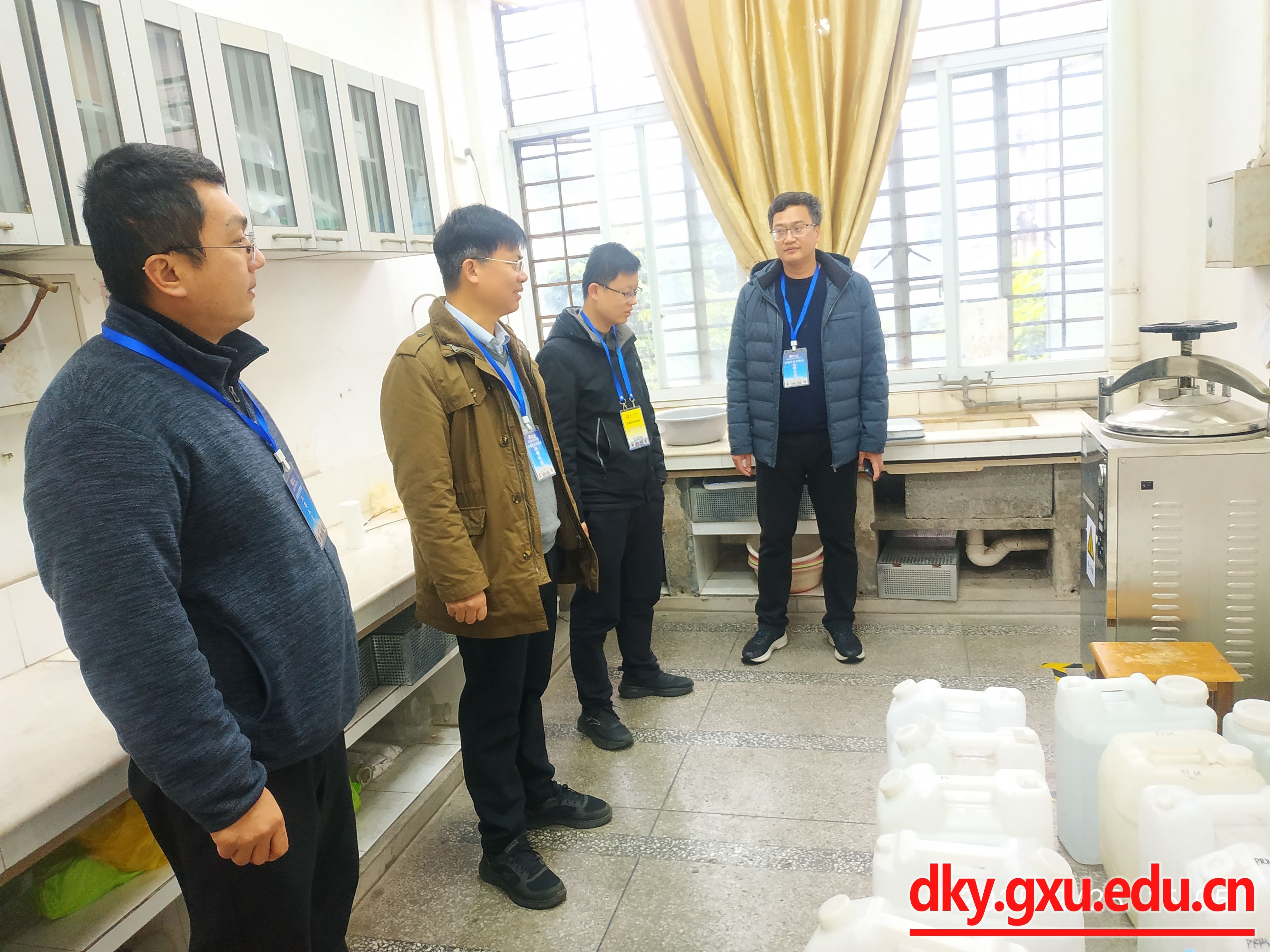 新学期伊始,为筑牢实验室安全防线,保障教学科研工作平稳有序开展,2月26日,乐鱼网站党委书记韦小强、副院长蒋钦杨副带队检查各教学和科研实验室安全。