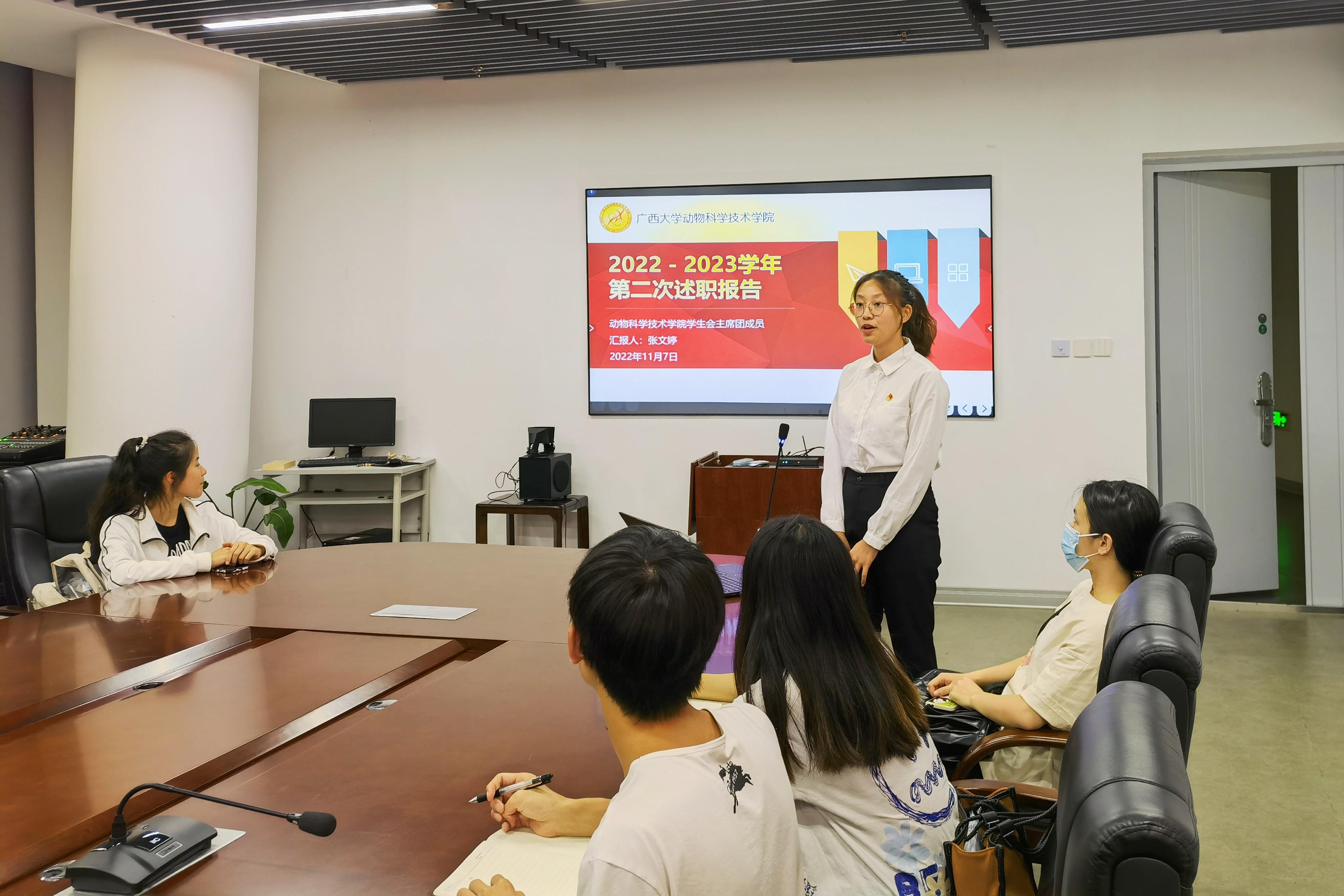 学生会主席团成员各自从思想政治、专业学习、工作成效、纪律作风和个人成长等方面依次进行述职。
