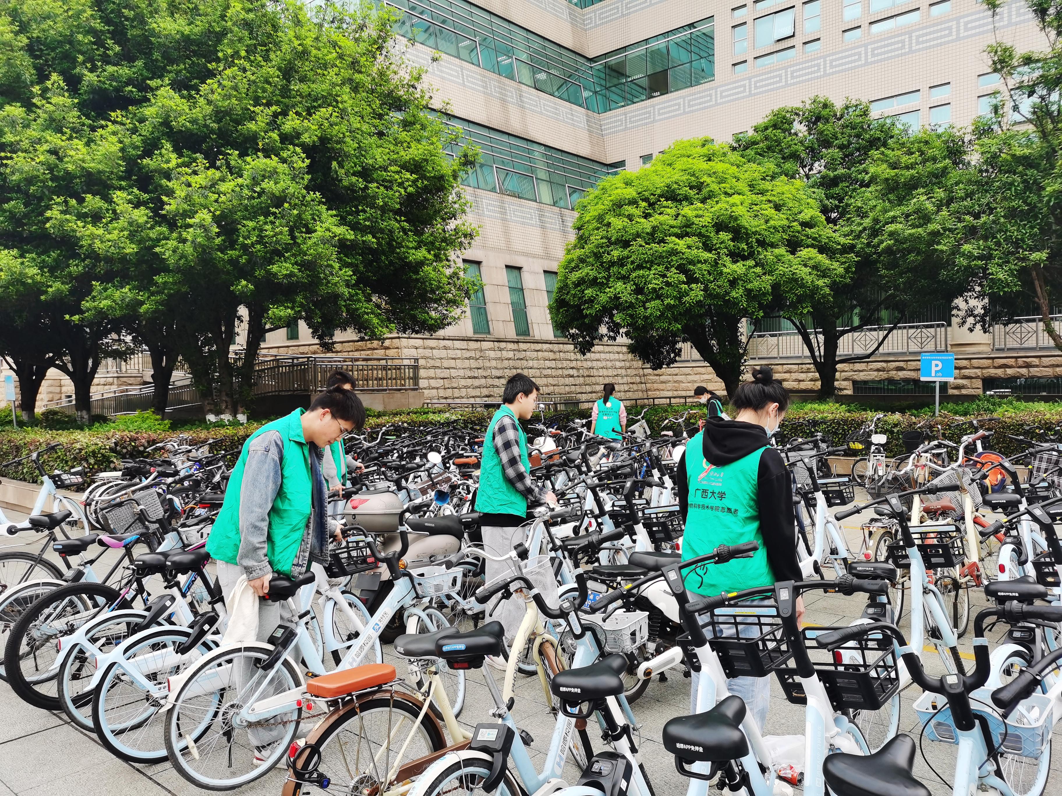 40余名志愿者身穿绿马甲,拿着抹布、扫帚等工具,分为多个小组在图书馆前坪、时光广场、第十教学楼前坪、第六教学楼前坪进行清扫。经过两个小时的辛勤劳动,整片区域焕然一新。干净的地面,整齐的单车,赢得了师生们的称赞和夸奖。