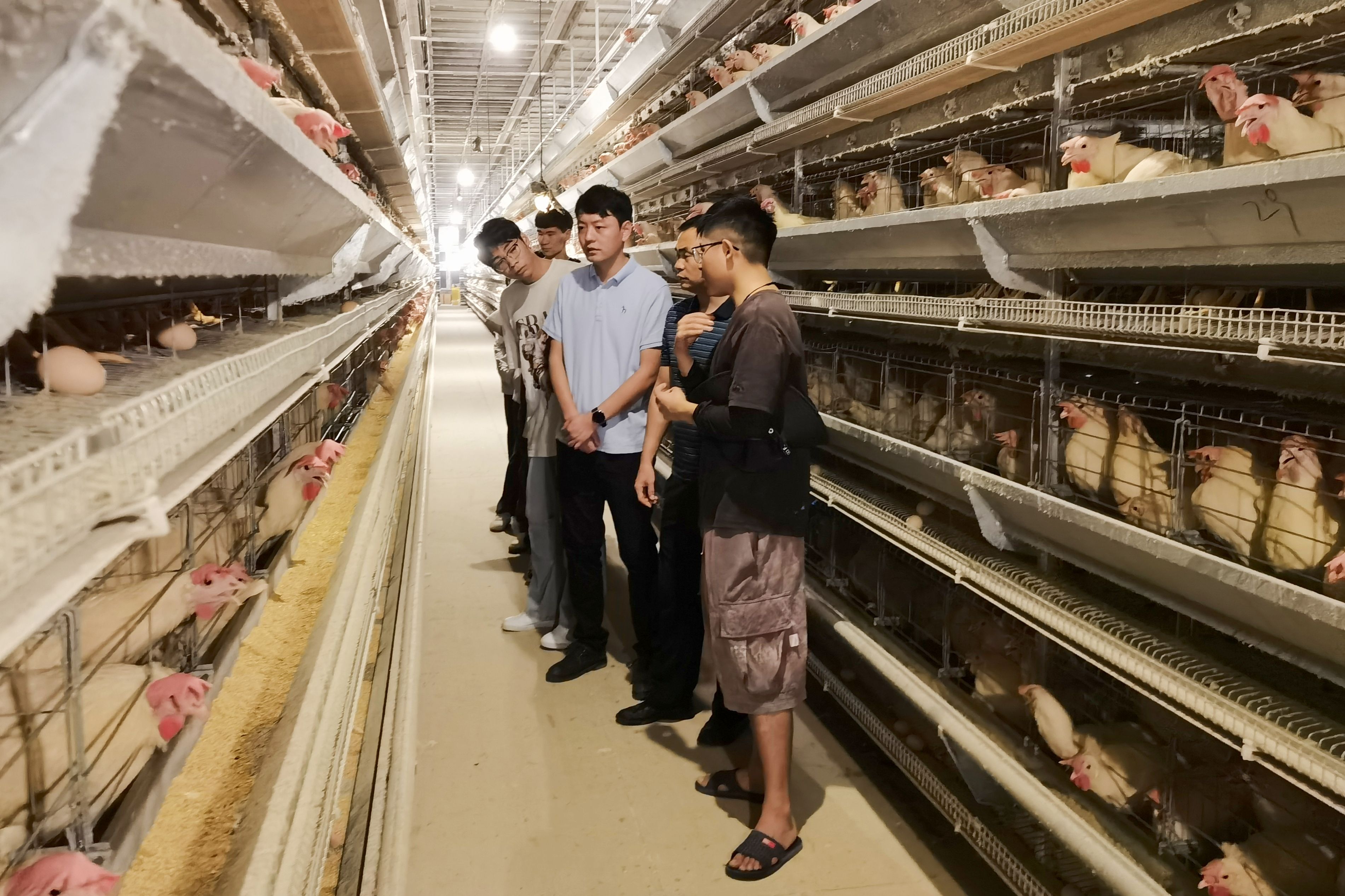 在广西三江腾竣农业有限公司的沙宜蛋鸡养殖示范基地,标准化鸡笼排列整齐,其喂料、拣蛋、集粪、光照、控温等程序全部自动运行。实践团师生通过实地参观全面了解企业的发展历程、业务板块、生态保护、粤桂协作等情况,并与技术人员详细探讨蛋鸡养殖的关键要素、创新工艺和实践经验。