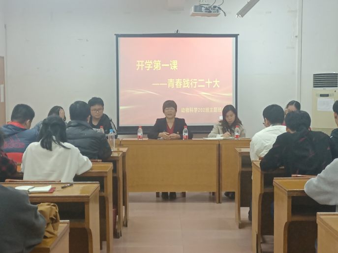2023年2月20日晚7:30,动物科学202班在动物繁殖研究所一楼会议室开展“开学第一课——青春践行二十大”主题班会。本次班会由班主任黄洁萍老师主持,学院党委书记顾慕娴老师、团委书记李丽娜老师及2名研究生受邀参加班会。