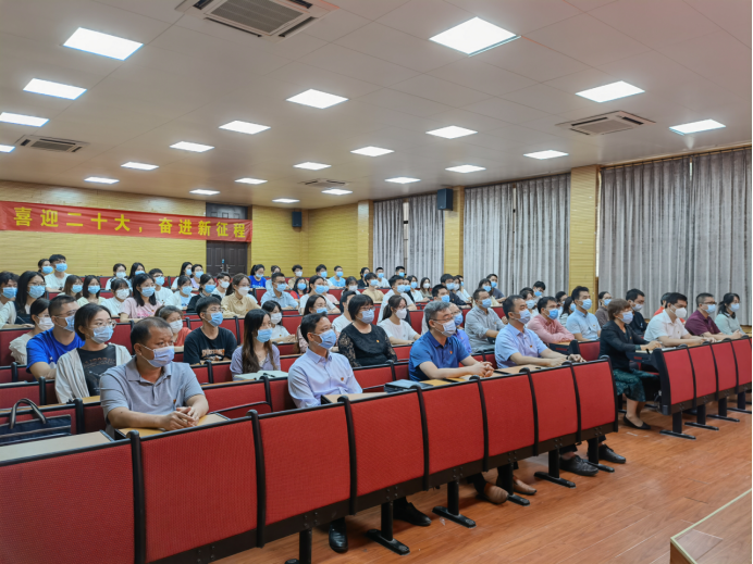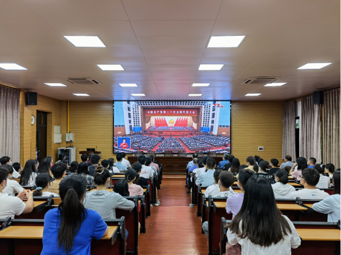 我院党委组织学院领导班子成员、理论学习中心组成员、各党支部书记、各党支部委员和部分师生党员代表在学院318会议室集中收看了本次大会实时直播,师生们端坐在大屏幕前,聚精会神观看。