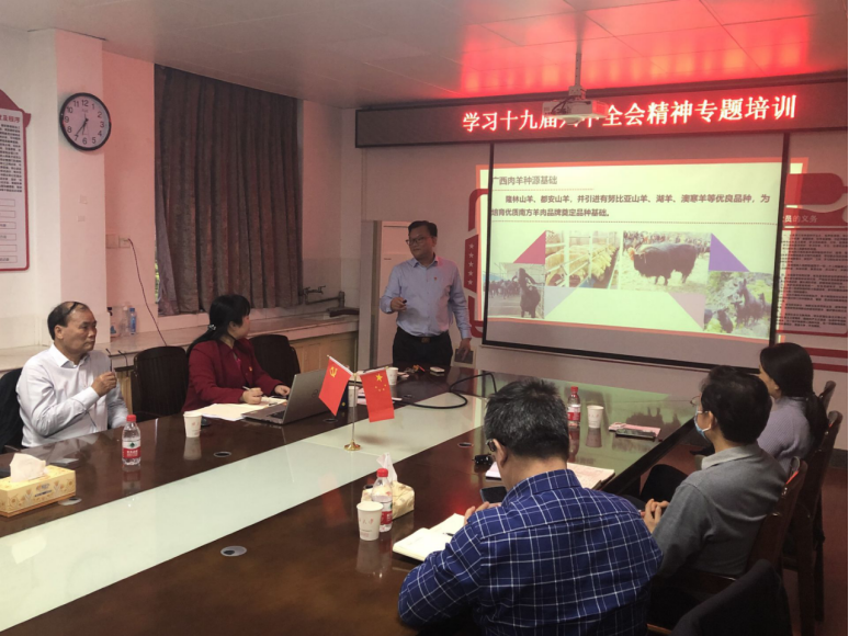 广西大学农牧产业发展研究院院长、广西牛羊产业创新团队首席专家、南方牛羊产业体系联盟首任主席韦英明教授讲授题为“发展牛羊产业,助力乡村振兴”的专题党课,通过形象生动的案例,激情洋溢地给支部全体党员讲述了广西牛羊产业发展技术成果、广西牛羊全产业链融合的初步形成、肉牛肉羊产业发展形势、牛羊养殖盈利运营案例等,在讲授到牛羊产业发展面临挑战和牛羊产业发展新机遇时,韦英明教授指出,支部党员应围绕乡村振兴科技需求和农业科技创新新领域,发挥兽医专业资源优势,在牛羊产业保健服务和疫病防控等方面开展科研课题研究,讲解了如何将科研论文写在祖国大地上,激励党员同志们针对生猪以及牛羊大产业的发展进行科研课题的研究,在扎实推进基础理论研究的同时,重视应用研究与畜牧产业发展的有机融合,将科研成果服务于产业发展。