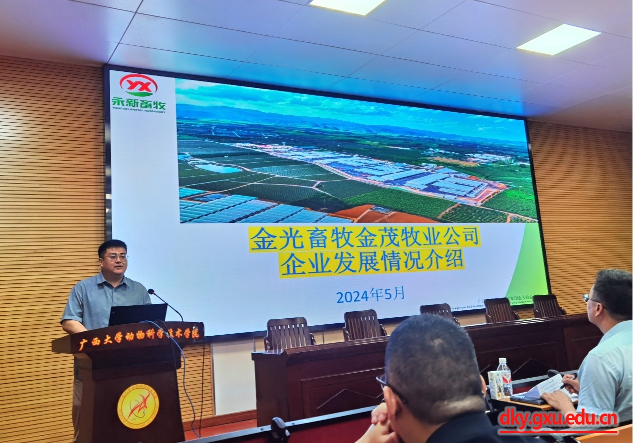 在会议中,陆阳清院长首先对生产实习做简单介绍,表达对企业的感激和对学生的勉励。金光畜牧有限公司副总经理马啸宇简单介绍了企业文化、猪场设计与运营和员工住宿等,牧原集团股份有限公司(广西)人力资源部经理李同坤介绍了公司的先进管理理念、先进技术和员工晋升等,广西新天地农牧集团有限公司人力资源部经理谢小兰介绍了公司的基本情况并表达了对实习生的勉励,广西石埠乳业有限责任公司生态观光牧场运营主管张男吉介绍了牧场的基本情况及员工生活和住宿等。班主任代表欧伟豪和林波两位老师强调了饲料生产和牛生产实习过程中的安全问题,动科系主任李辉副教授简单介绍了生产实习的方案及注意事项。最后,蒋钦杨副院长对本次会议进行总结,再次感谢企业为学生提供实习的岗位。