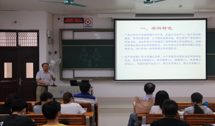 其次,水产学科黄凯、韦友传老师以自身的研究方向为基础,向同学们介绍了水产学科的特点和科研成果,激发了同学们对本校水产学科的研究兴趣;同时,老师们展示了自己与优秀毕业生的生活经历,进一步加深了学生对研究生生活的向往,增强了考研自信心。此外,老师们还介绍了专业发展前景和就业信息,消除了同学们的就业疑虑,激发了同学们的报考热情。