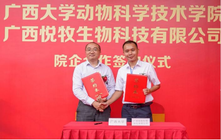 乐鱼网站司红彬副院长与广西悦牧生物科技有限公司总经理张远波代表双方现场签署了院企合作协议书。乐鱼网站将充分发挥自身理论与技术领域的优势,为广西兽医社会化服务示范点兽医人才开展统一培训,补充理论基础知识及规范实验操作技术,率先共建联合研发平台,共同推进“产学研用”的协同创新的新农科人才培养模式,做好兽医社会化服务的人才支撑,为地方经济发展做出贡献。