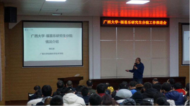 紧接着动科院司红彬副院长介绍了广西大学—福喜乐研究生分院相关情况。为了更好的助推广西大学教学办成特色鲜明的一流研究型大学,建设产学融合的高水平专业人才培养平台,司副院长对于联合培养的运行机制、政策及相关内容进行了介绍。