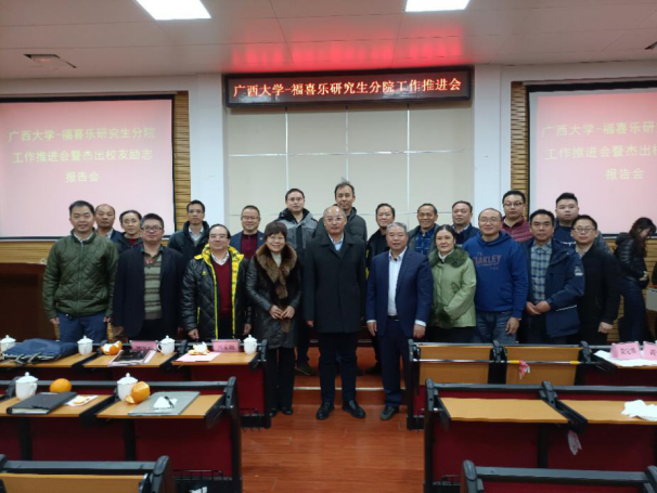 2021年1月8日,为推动广西大学-福喜乐研究生分院工作进行,深化“产教融合”创新研究生培养体系建设,我校冯家勋副校长、研究生院蒋艳明副院长、科技处黄大安主任、顾慕娴书记、陆阳清副院长、司红彬副院长及乐鱼(中国)的部分老师、研究生,福喜乐公司黄定寿董事长、黄定雄总经理、马晓主任等参加了在乐鱼(中国)举办的广西大学—福喜乐研究生分院工作推进会,校友黄定寿先生做了爱农务农励志报告会。