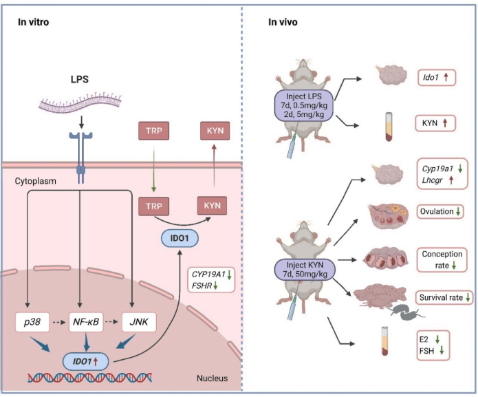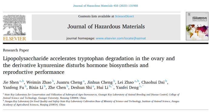 2023年7月,我院石德顺研究员团队邓彦飞副教授在国际Top期刊《Journal of Hazardous Materials》(中科院一区,Top 2%,IF=13.6)在线发表了题为“Lipopolysaccharide accelerates tryptophan degradation in the ovary and the derivative kynurenine disturbs hormone biosynthesis and reproductive performance”的研究成果,首次报道了环境中细菌内毒素(脂多糖/LPS)引发卵泡颗粒细胞色氨酸/犬尿氨酸代谢异常(犬尿氨酸堆积)影响动物卵巢功能和繁殖性能的新机制。内毒素是革兰氏阴性菌细胞壁的主要组成成分,以脂多糖(Lipopolysaccharide, LPS) 为主要代表。在细菌死亡和裂解时,LPS被释放到周围环境中。由于其化学和热稳定性较强,LPS可以在多种环境条件下长期存在。随着畜牧业养殖规模增加和养殖密度提高,因饲养管理不善常常造成动物所处的生活环境较恶劣,因而更容易受到细菌和LPS的感染。现有研究表明,动物感染LPS时,LPS可通过血液循环进入卵泡液并作用于卵泡颗粒细胞而影响其功能,如导致激素分泌失衡、卵巢功能衰竭等,最终引起繁殖性能降低,但其潜在机制尚不清楚。该研究发现,LPS作用于猪卵泡颗粒细胞时可通过p38, NF-κB和JNK信号通路增强色氨酸代谢的关键酶Ido1的表达,从而引起色氨酸代谢加速,造成其衍生物犬尿氨酸堆积,进而抑制Cyp19a1和Fshr的表达,减少雌激素合成,最终影响猪卵泡颗粒细胞的功能。进一步的小鼠模型研究结果也表明,LPS诱导小鼠卵巢中Ido1高表达,并引发血液中犬尿氨酸水平升高。通过直接给小鼠腹腔注射犬尿氨酸可发现激素分泌失衡,并显著抑制了排卵和黄体形成,最终降低了繁殖性能(受胎率和活仔率降低)。该研究阐明了LPS感染通过诱导色氨酸代谢紊乱影响动物卵巢功能和繁殖性能的机制,首次发现色氨酸-犬尿氨酸代谢紊乱(犬尿氨酸堆积)破坏卵巢功能、降低动物繁殖性能。该研究为提高家畜繁殖效率乃至治疗人类卵巢功能障碍引起的不孕提供了新的见解。