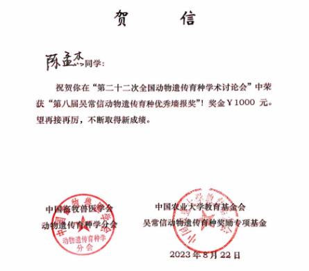 第二十二次全国动物遗传育种学术讨论会是我国动物遗传育种领域进行学术交流的一个优秀平台。此次大会以“BT+IT驱动种业振兴”为主题,汇集了猪遗传育种、家禽遗传育种技术、草食动物遗传育种技术、基因组选择与统计基因组、家禽基因编辑、基因组组装与功能解析、微生物组与畜禽遗传育种等方向的最新科研成果。交流方式包括主会场特邀报告、分会场报告以及墙报。我院博士研究生张叁保(导师:蒋钦杨)、陈孟杰(导师:石德顺、李辉)、陈亚玲(导师:李湘萍、李辉)、朱锐锐(导师:黄洁萍)分别做了口头汇报和墙报,其中,张叁保和朱锐锐口头汇报荣获优秀论文奖,陈孟杰荣获青年学者旅行奖和优秀墙报奖。通过参加本次学术讨论会,大家学习了动物遗传育种学领域的最新科研成果、研究动态与趋势,这有助于梳理和扩展研究思路,更好地规划未来的研究方向。