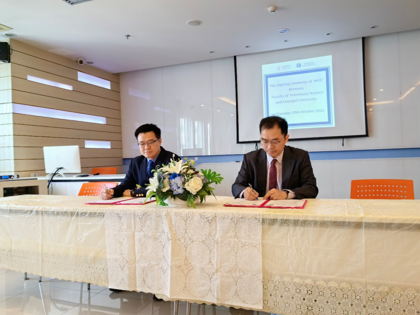 陆阳清院长与朱拉隆功大学兽医学院学术、国际和学生事务副院长、朱拉隆功大学兽医学院亚热带农业生物资源保护与利用国家重点实验室首席研究员Sonthaya Tiawsirisup博士共同签署合作框架协议,双方教职工代表在合作备忘录签署仪式合影留念。