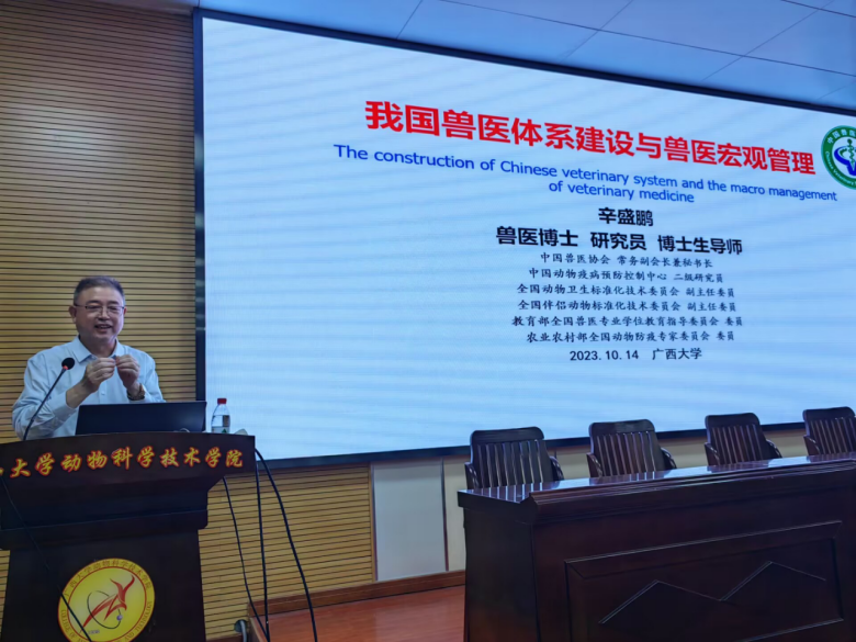 2023年10月14日上午,在乐鱼网站318报告厅,中国动物疫病预防控制中心原副主任、中国兽医协会副会长兼秘书长辛盛鹏研究员应邀为广大师生做了一场主题为“我国兽医体系建设与兽医宏观管理”的报告。广西大学副校长罗廷荣教授主持报告会,会场近300个座位座无虚席。