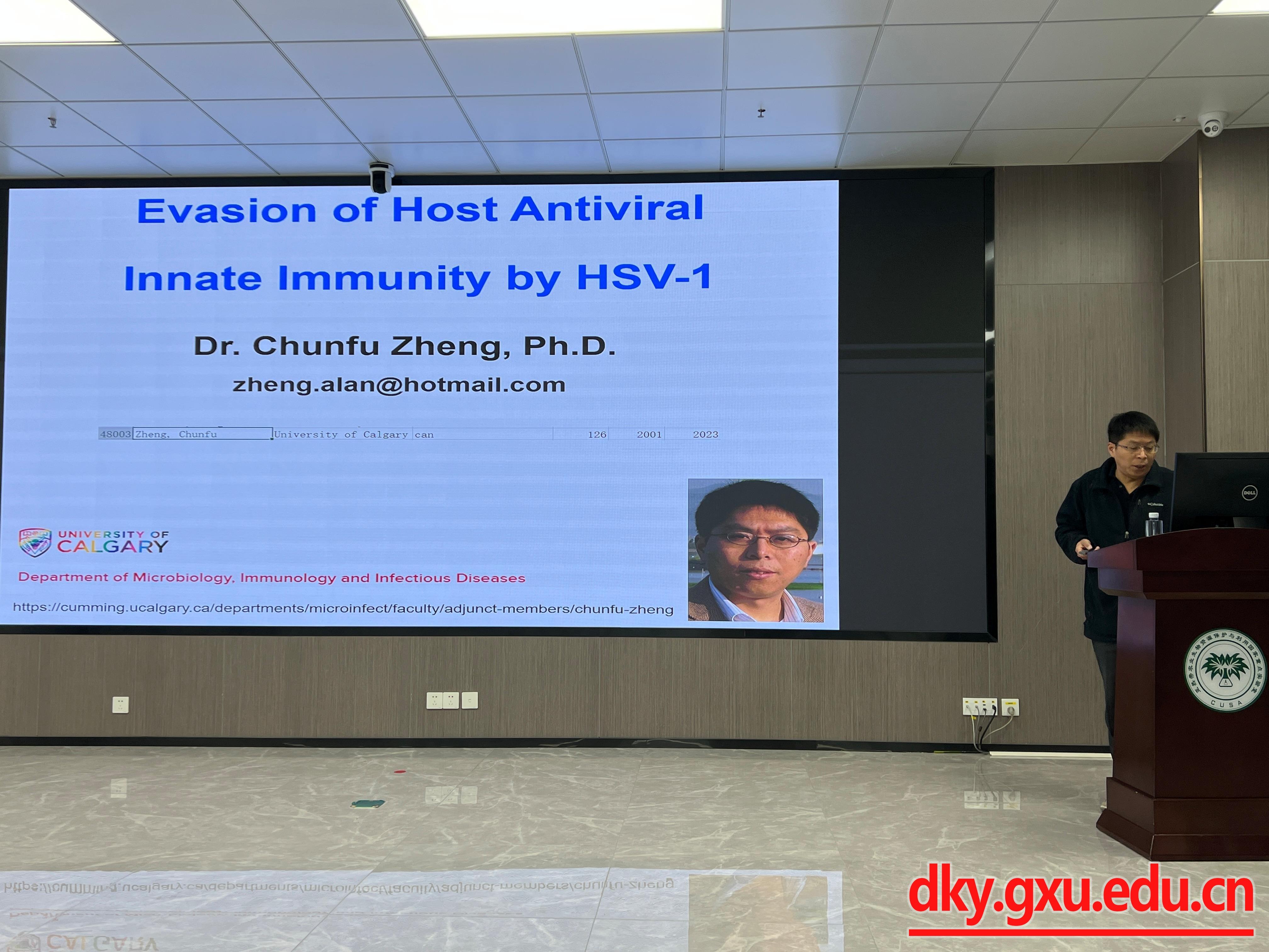 12月22日上午,加拿大卡尔加里大学郑春福教授在广西大学国家重点实验室107会议室作题为 “Evasion of host antiviral innate immunity by HSV-1”的学术报告。报告会由乐鱼(中国)副院长韦祖樟教授主持,乐鱼(中国)磨美兰教授、韦天超副教授、欧长波副教授等教师以及100多名师生参加报告会。
