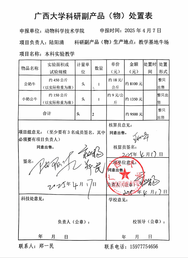 按照《广西大学科研副产品(物)管理办法(试行)》规定,经项目负责人陆阳清申请,现对其科研副产品(物)处置情况公示,公示期2025年5月7日-5月13日。