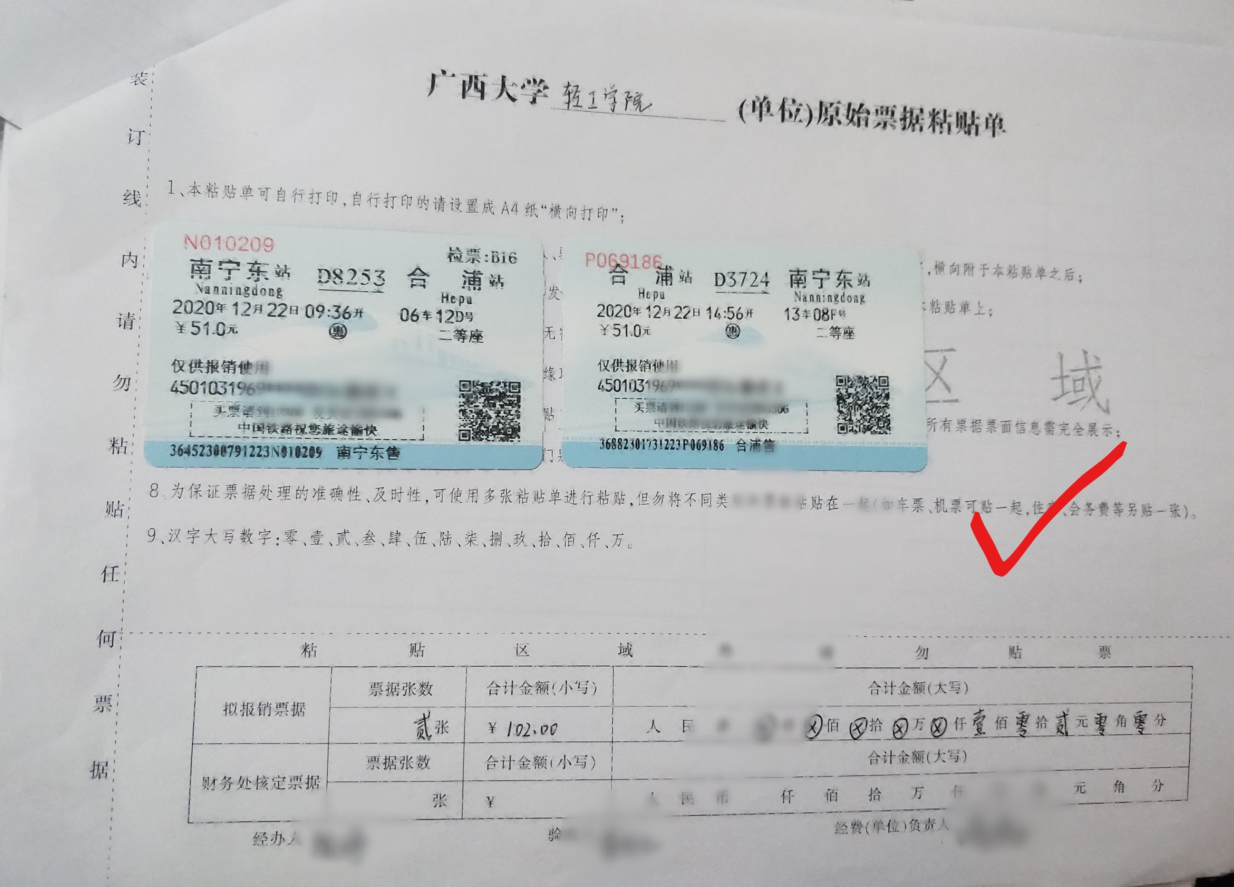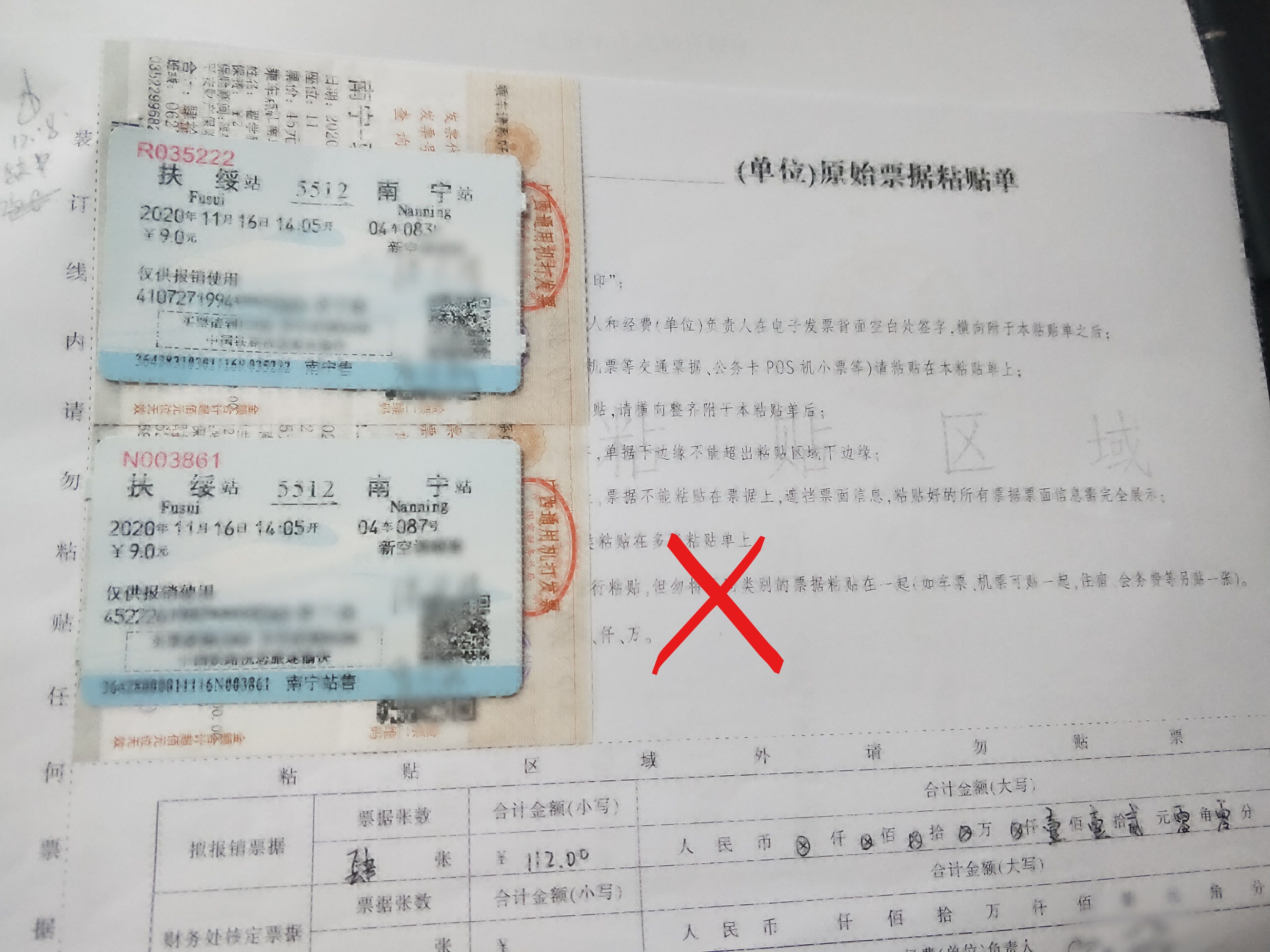 1.较小的票据(如火车汽车票、出租车票、定额发票等)平铺粘贴在“广西大学原始票据粘贴单”上,不能重叠粘贴在票据的上面,以免票面信息被粘住;过多的小票据可分多页粘贴。